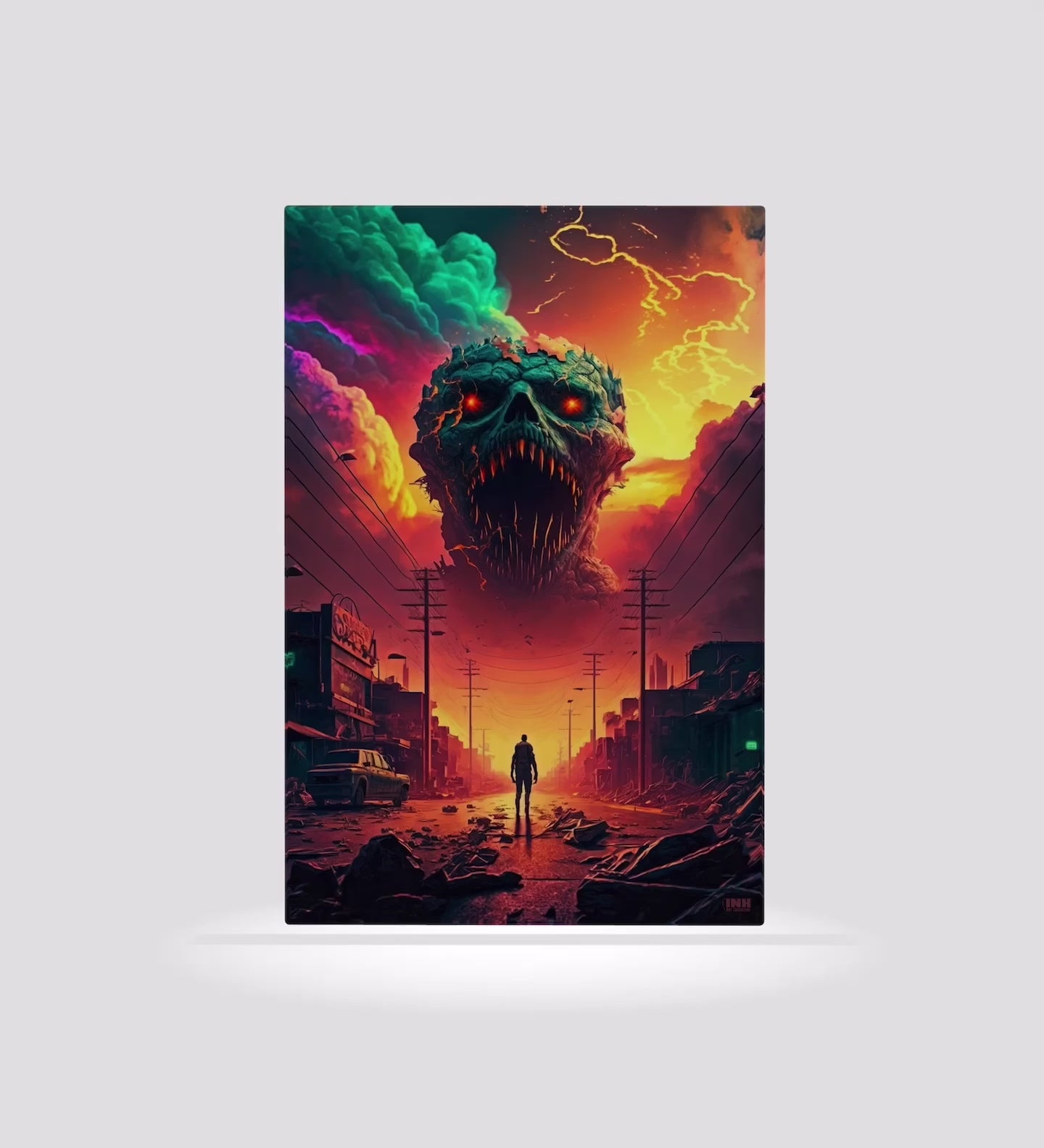 Step into a post-apocalyptic dreamscape with the Apocalypse Rising Canvas Wall Art. This surreal piece captures a lone figure walking through a devastated city street as a monstrous skull-like entity emerges from the fiery clouds above. With glowing red eyes, jagged teeth, and storm-lit skies, the artwork blends horror, fantasy, and urban decay into a visually striking narrative.