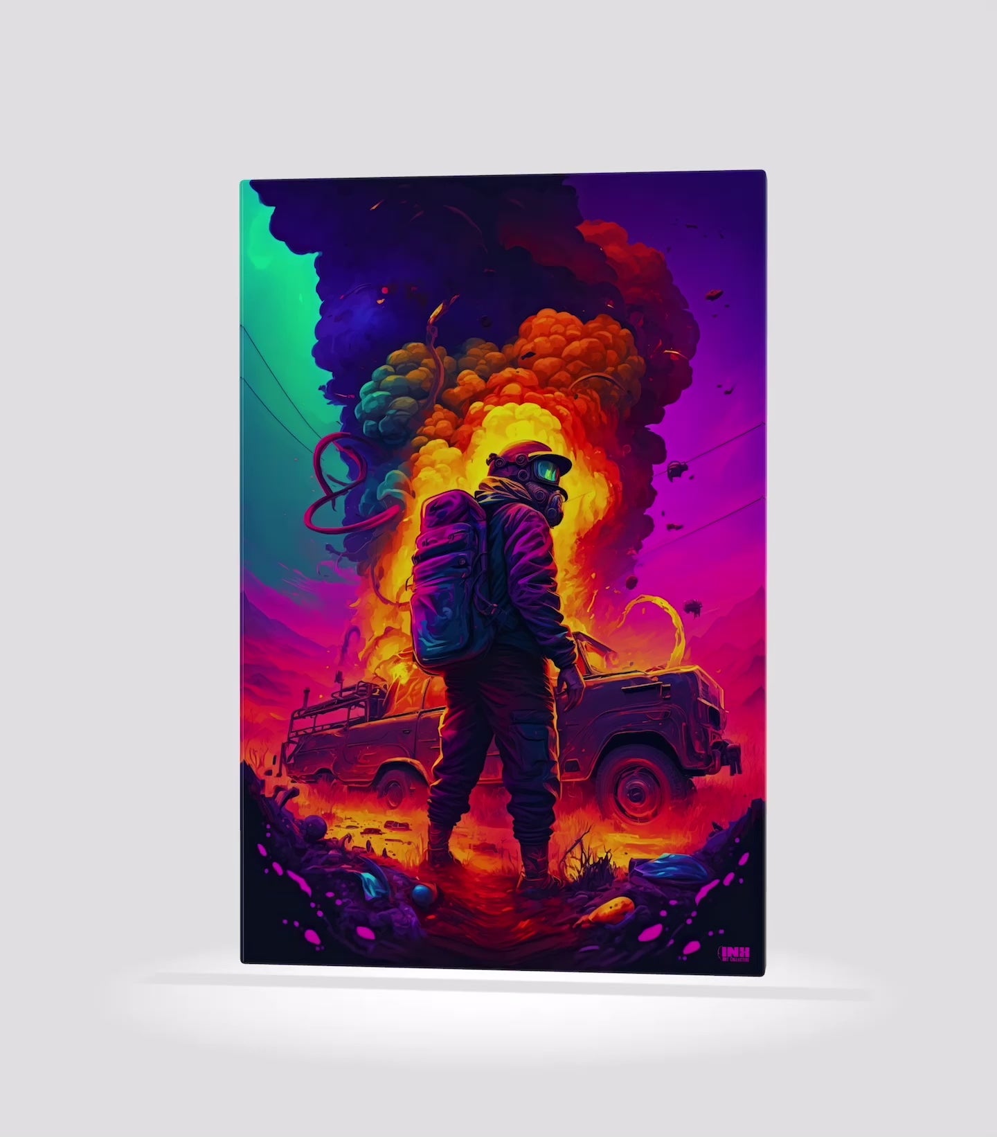 Step into a futuristic world with this Apocalyptic Traveler Abstract Canvas Wall Art, featuring a lone figure in a gas mask standing before a burning vehicle. With neon tones of orange, purple, and pink blending into bold smoke and fire, this artwork captures the energy of dystopian and sci-fi worlds.