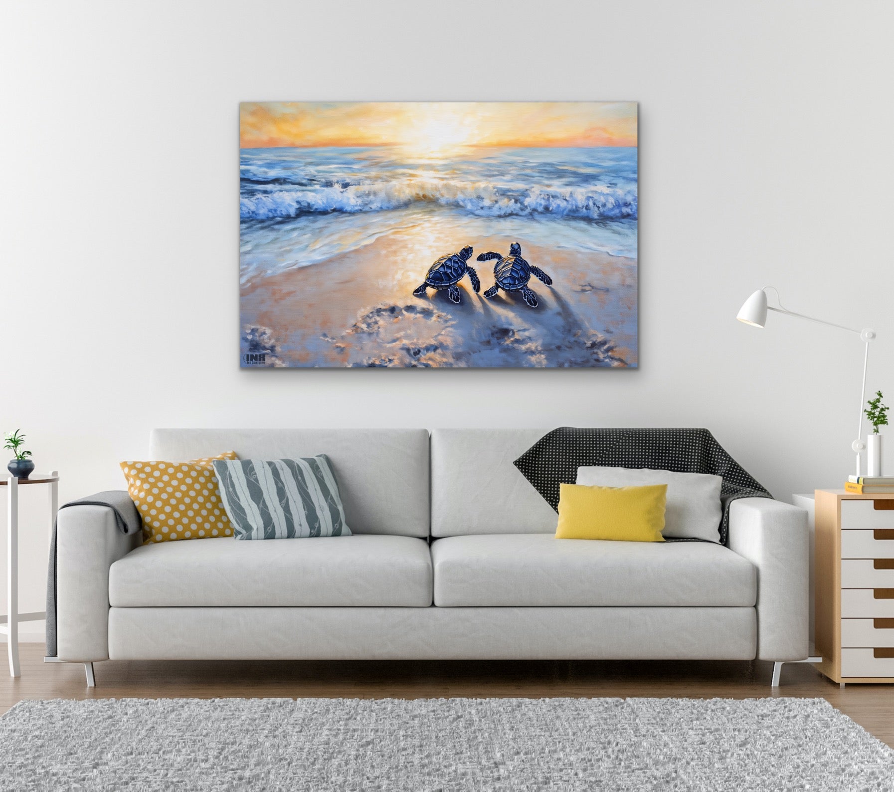 Bring the calm beauty of the ocean into your home with this Baby Sea Turtles Canvas Wall Art. Featuring two gentle sea turtles making their way across the sand toward the waves at sunset, this piece captures the serenity and magic of coastal life.