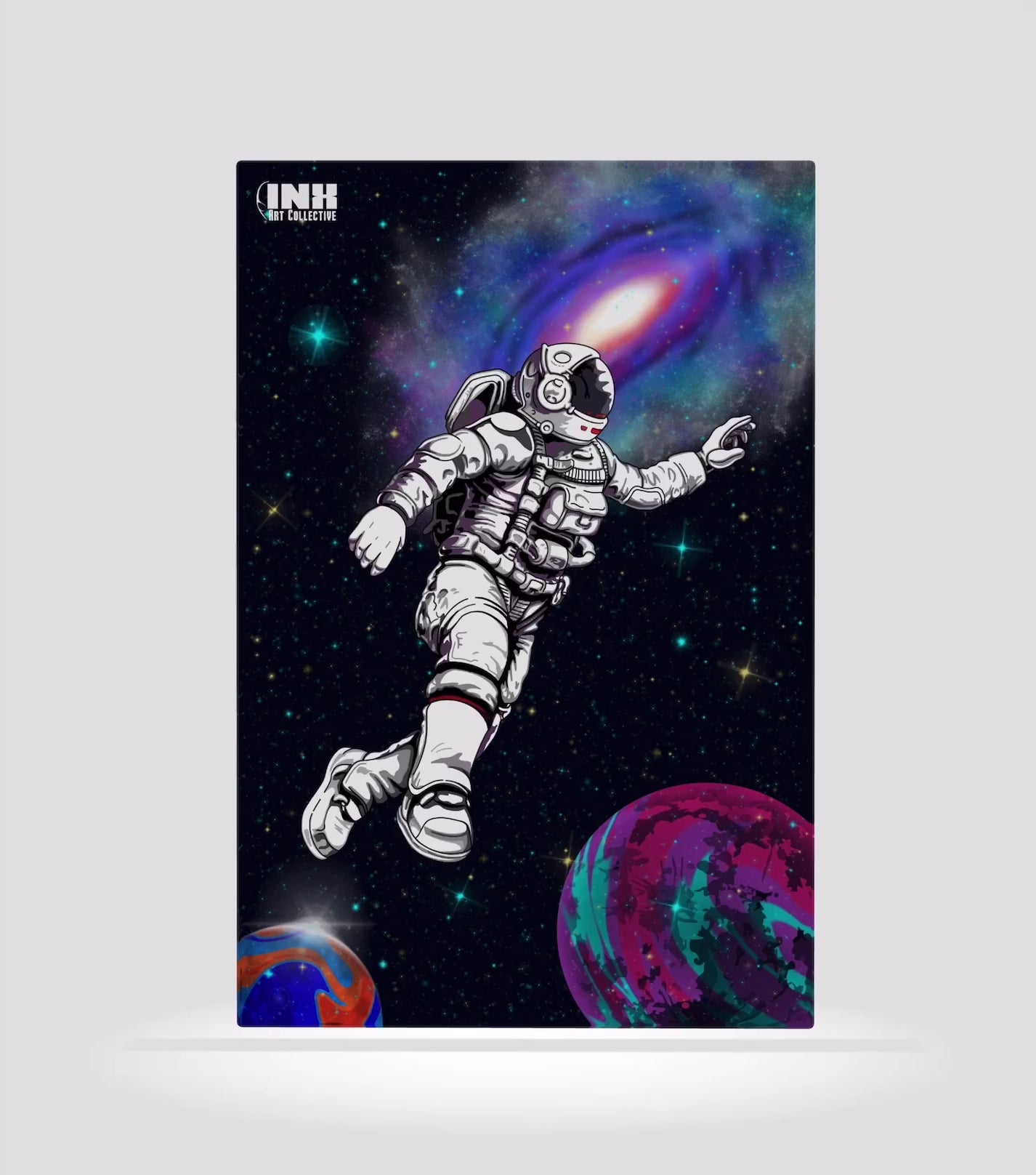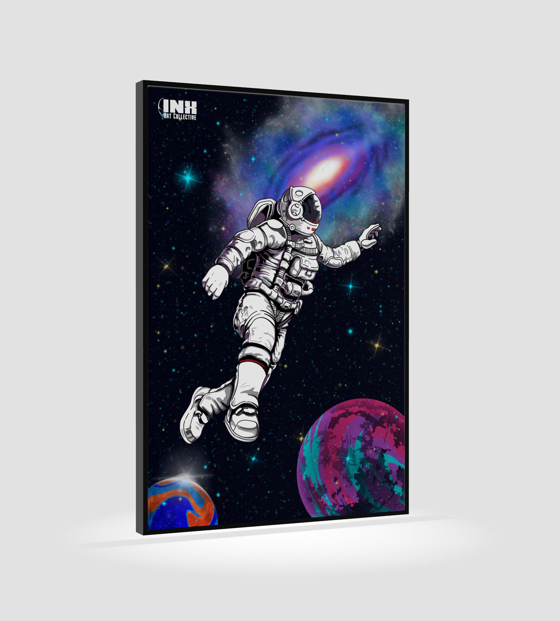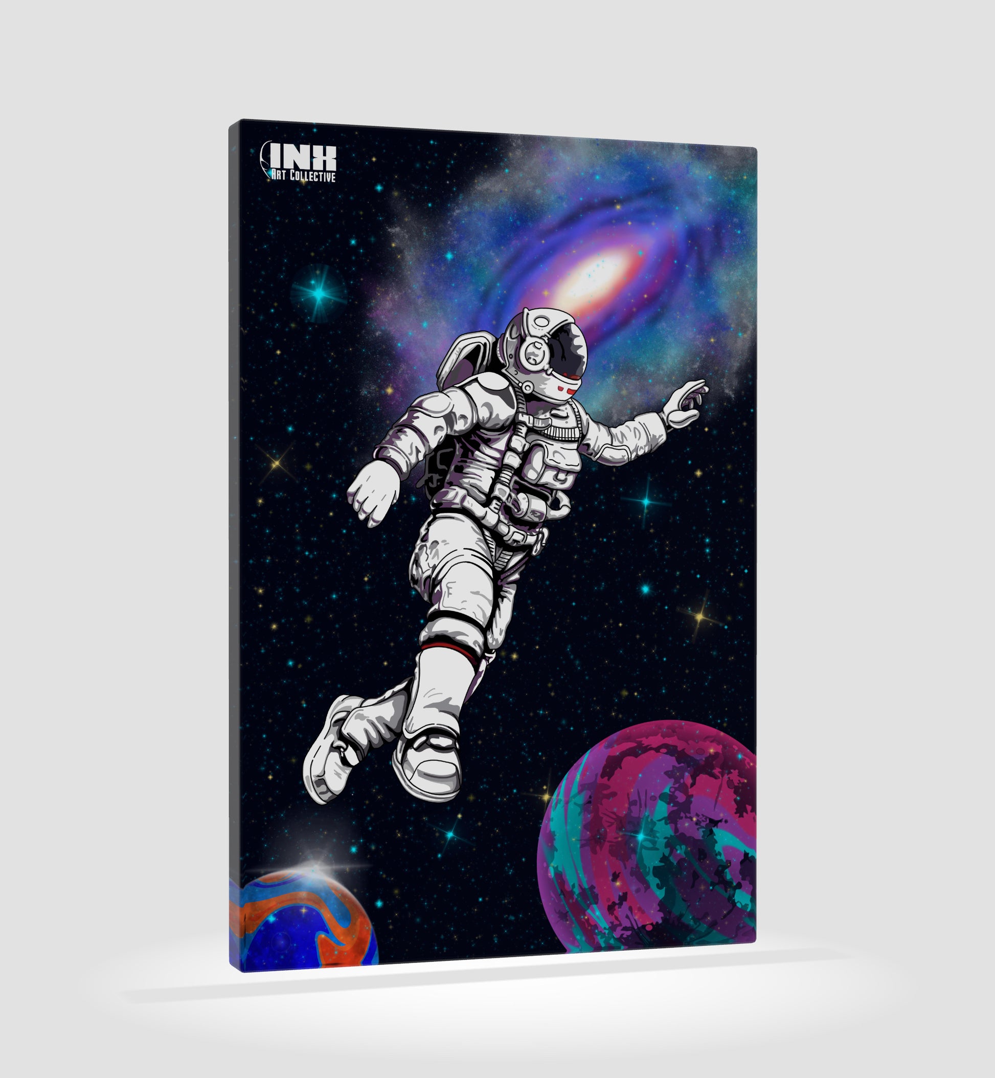Add cosmic energy and inspiration to your décor with this playful astronaut artwork.