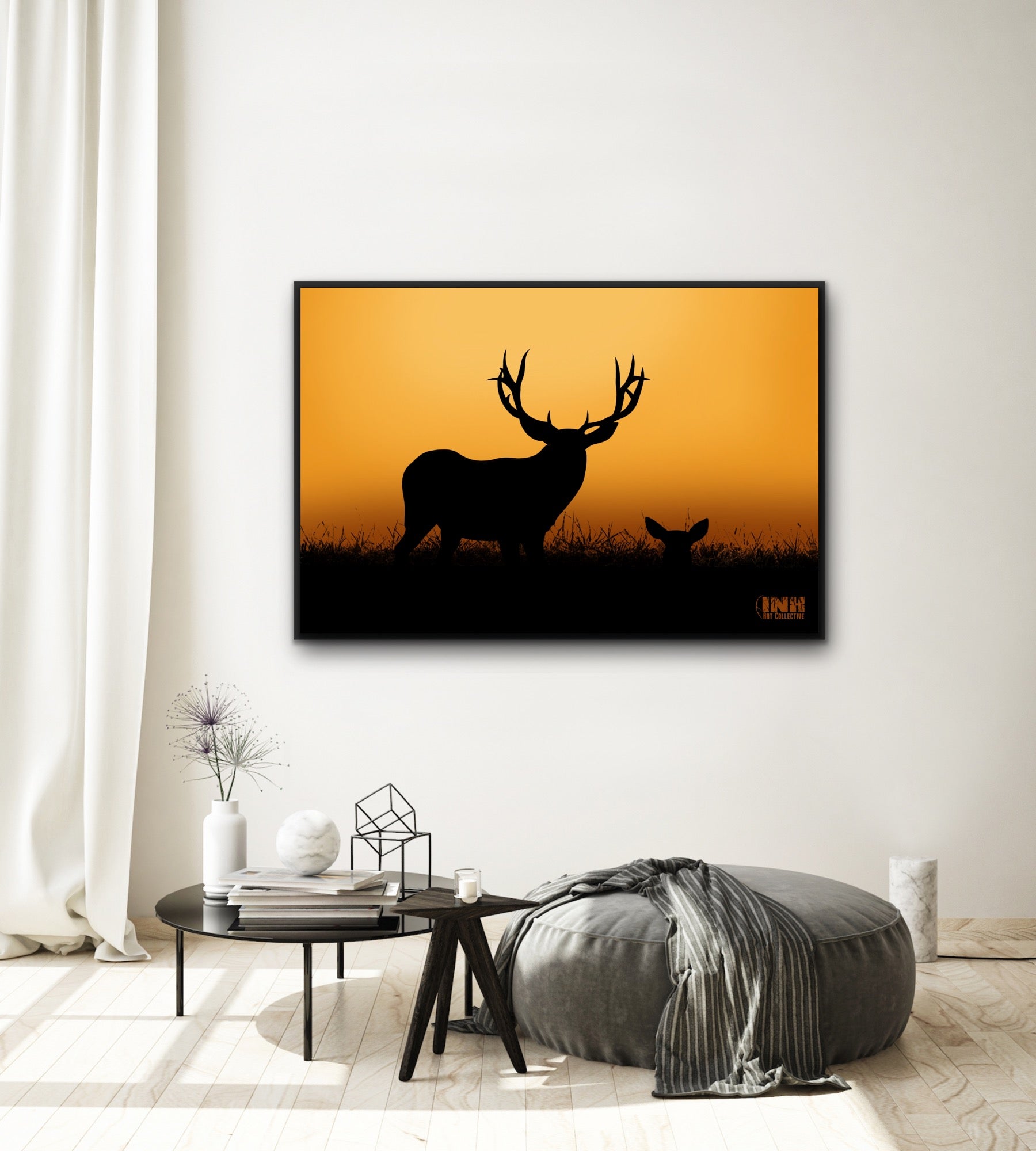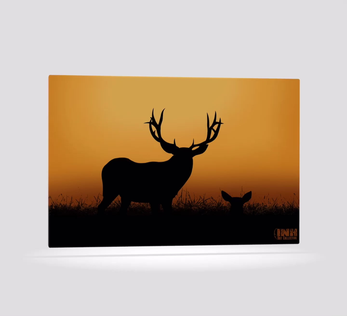 Bring the quiet beauty of nature into your home with the Deer Silhouette Sunset Canvas Wall Art. Featuring a striking black silhouette of a stag and doe set against a warm golden sunset, this piece captures the peaceful essence of the wilderness at dusk.