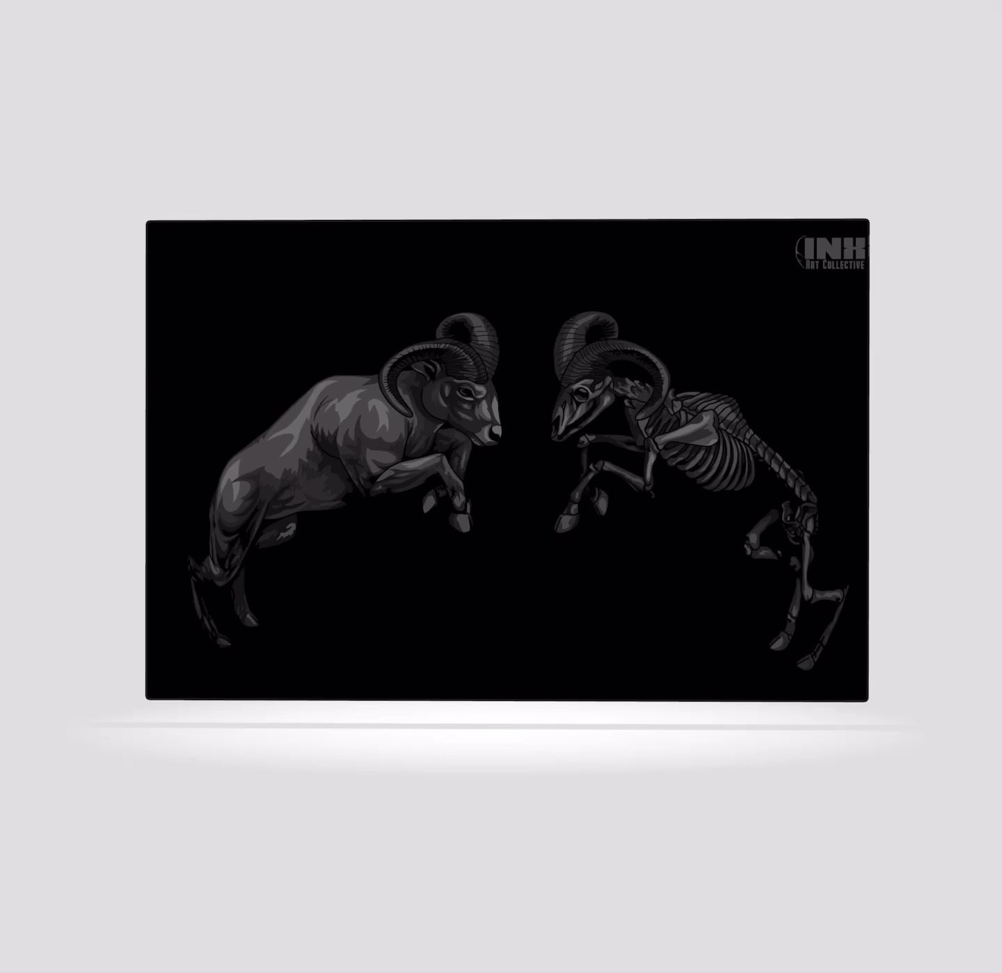 Embrace the balance of strength and mortality with the Duality Ram Canvas Wall Art. This bold monochrome artwork features a powerful ram facing its skeletal reflection, symbolizing resilience, duality, and the eternal clash between life and death. The sharp contrasts and detailed linework create a dramatic piece that draws the eye and sparks conversation.
