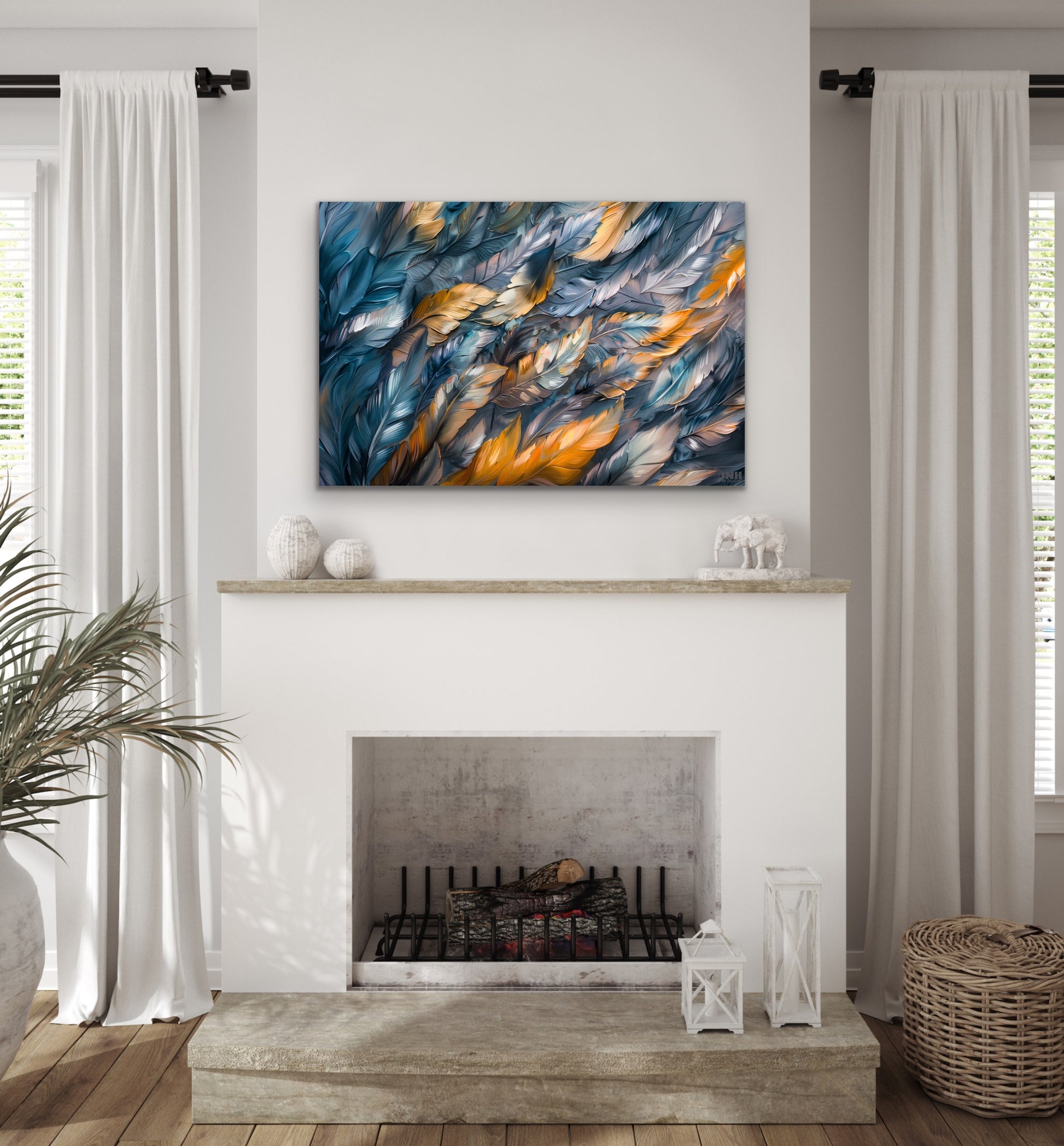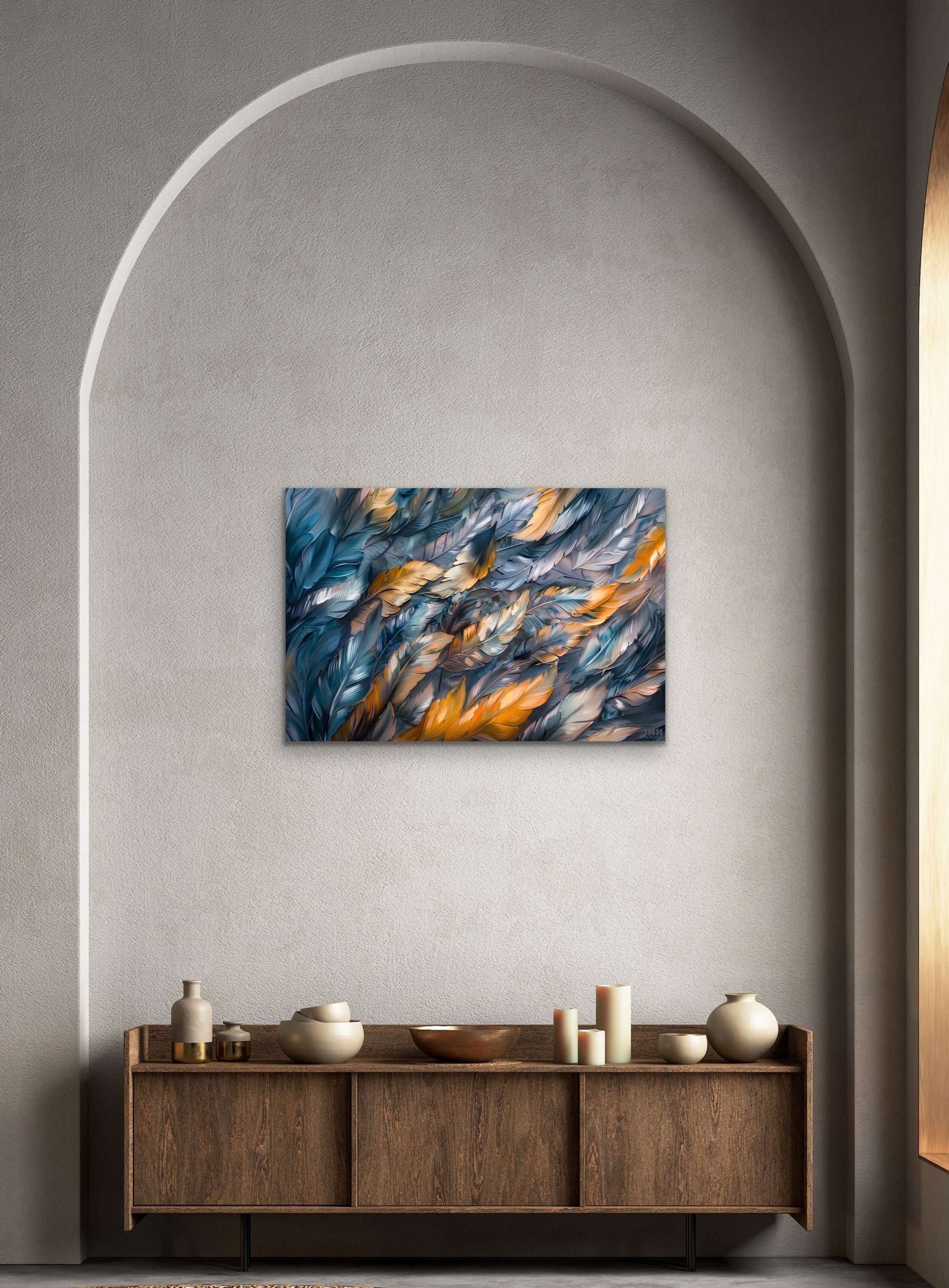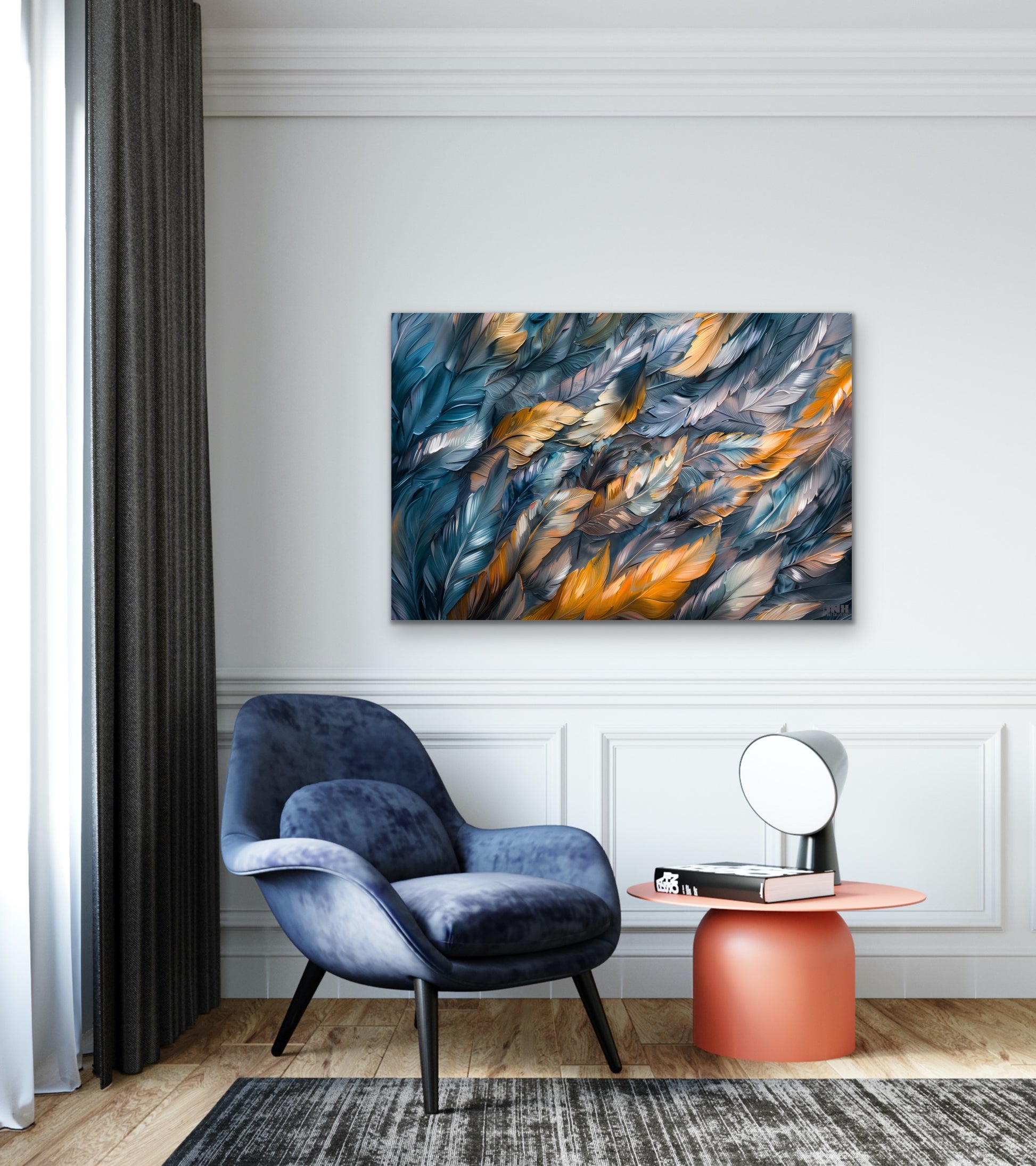 Bring elegance and texture to your walls with the Golden Blue Feather Canvas Wall Art. Featuring a layered arrangement of feathers in shimmering gold and deep blue tones, this artwork blends softness with a striking sense of movement. The painterly strokes and rich colors create a calming yet luxurious feel that makes a bold design statement.