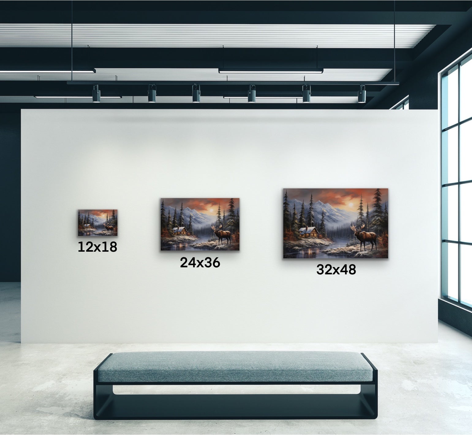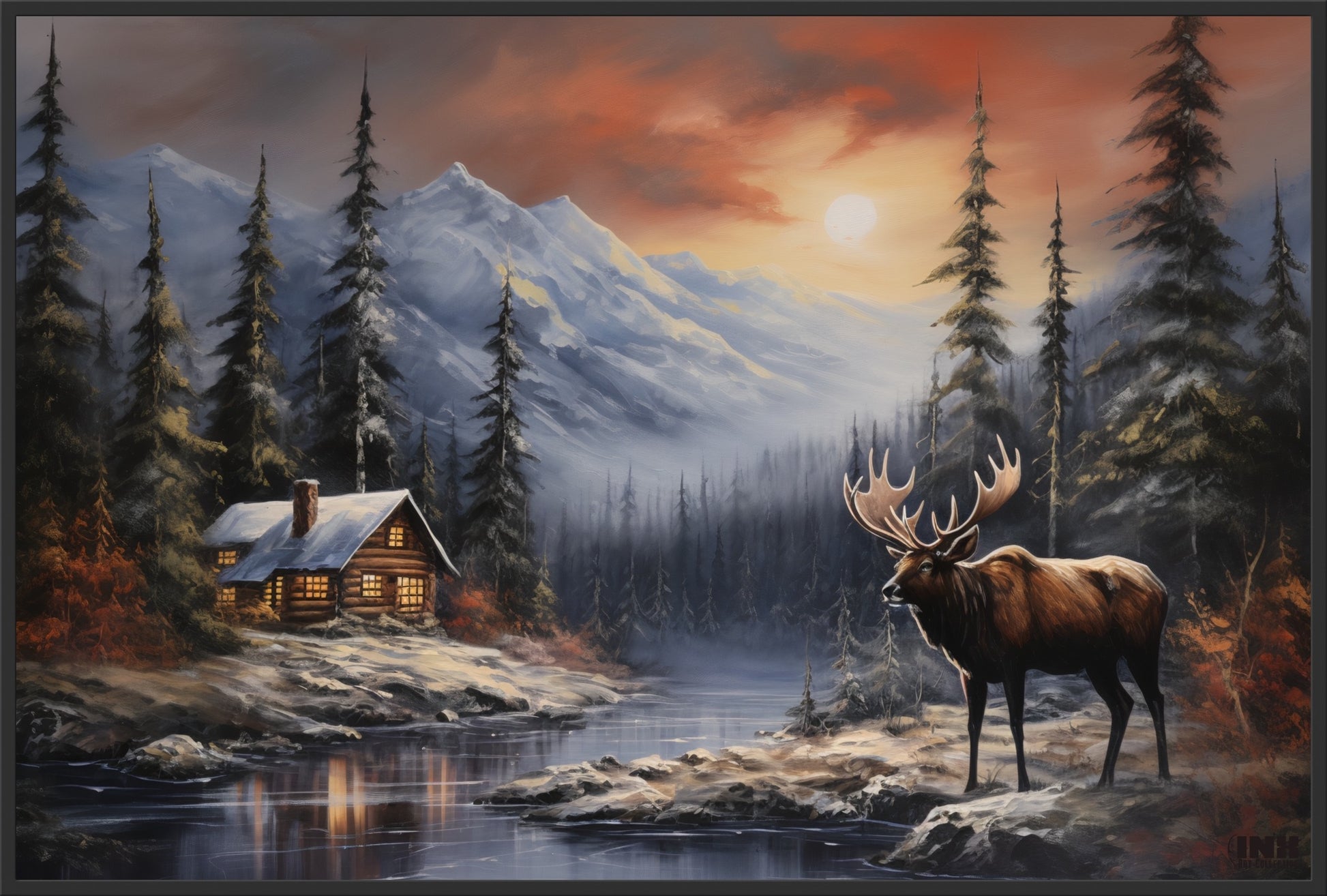 Introducing the "Wildwood Retreat”canvas art print, a captivating masterpiece that brings the rustic charm of a cabin in the woods together with the majestic presence of a moose, all rendered in the rich and vibrant hues of acrylic painting. Meticulously crafted, this artwork invites you to step into a serene wilderness scene where nature and architecture harmonize in perfect balance.