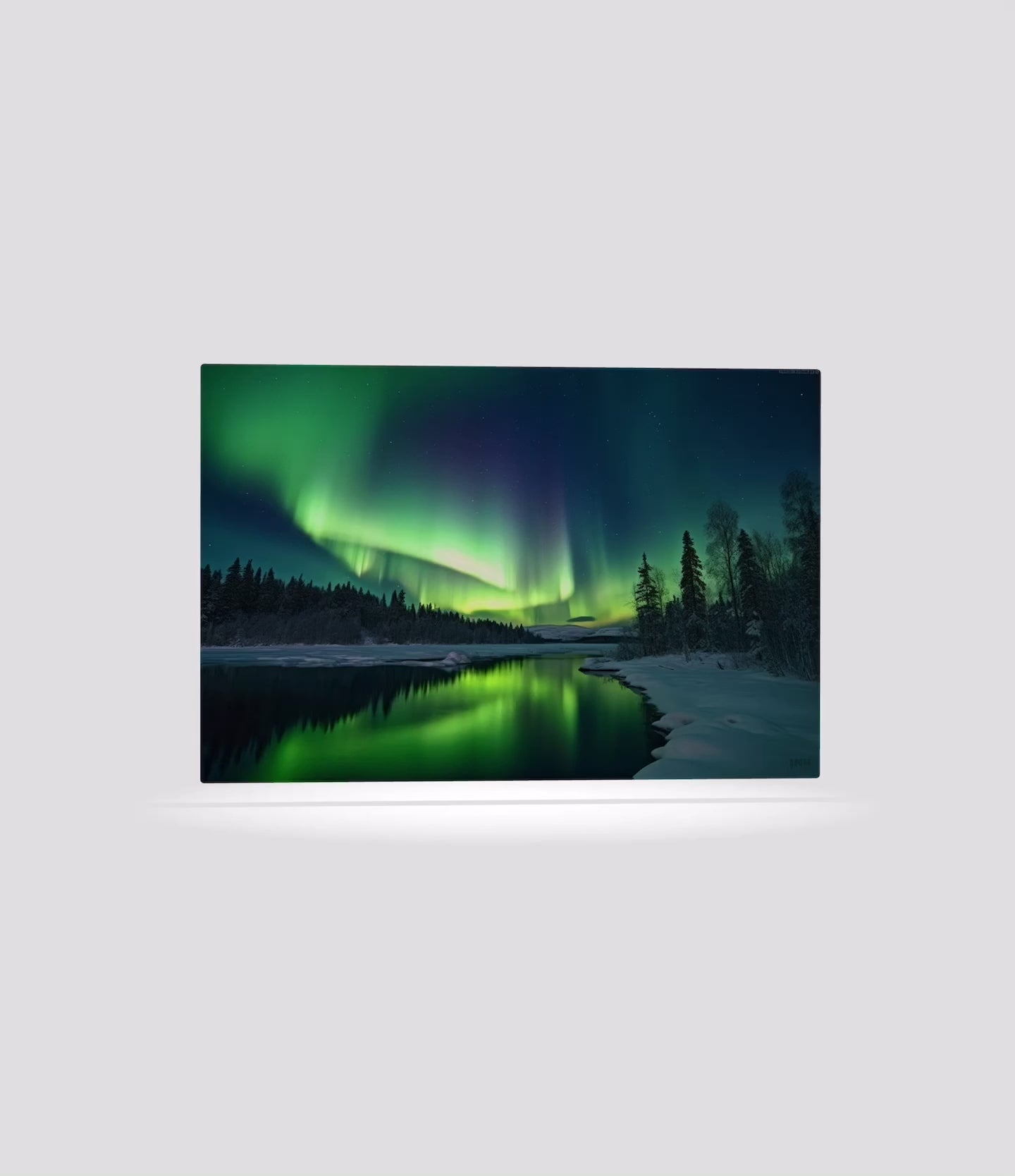 Experience the awe of the Arctic sky with the Northern Lights Canvas Wall Art. This breathtaking piece captures the vivid dance of green auroras as they ripple across a starry night sky, reflecting over a still, snowy landscape. The contrast of luminous light against the serene, frozen forest creates a scene of pure natural wonder.