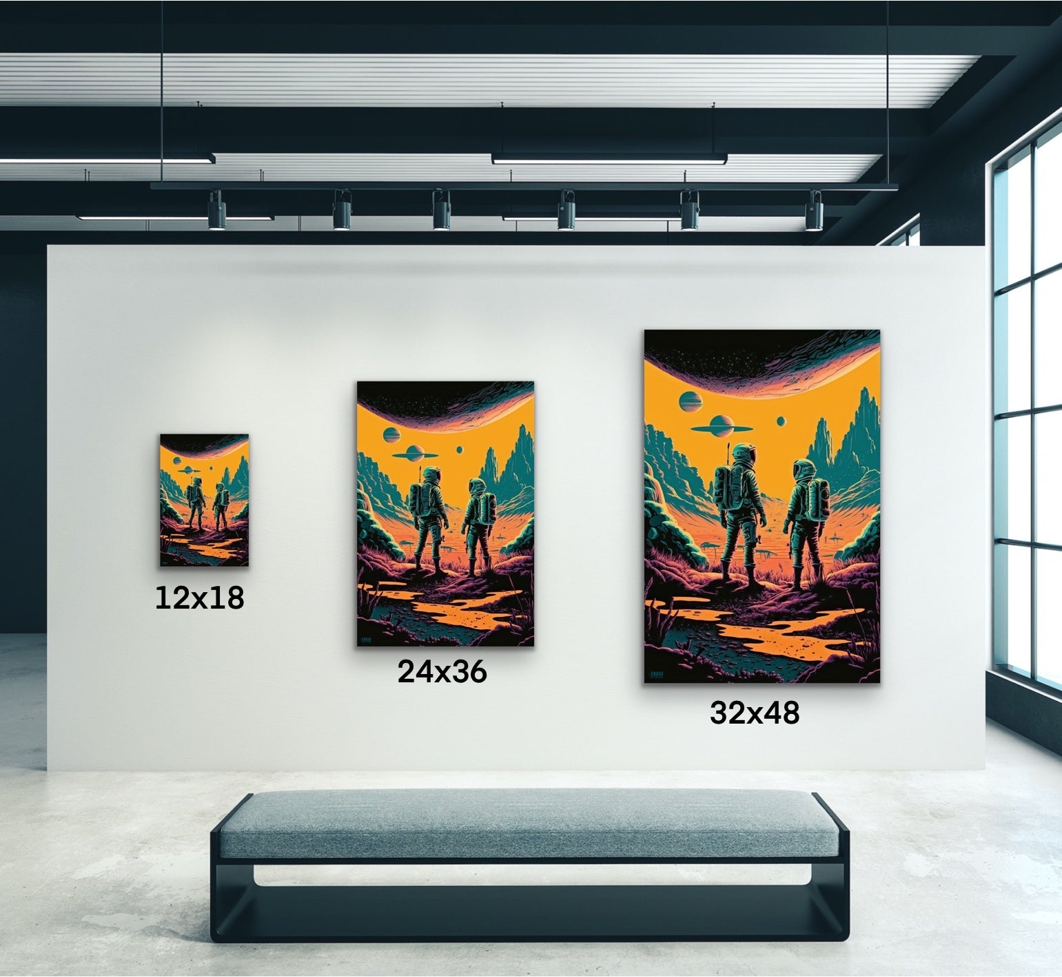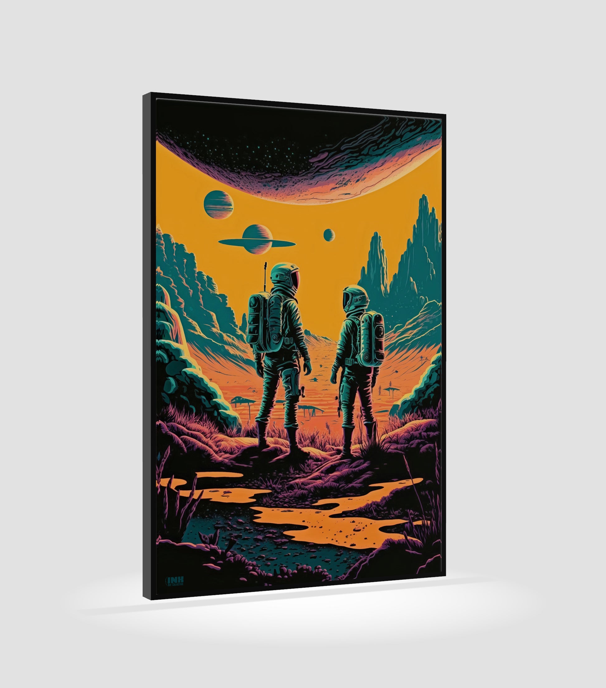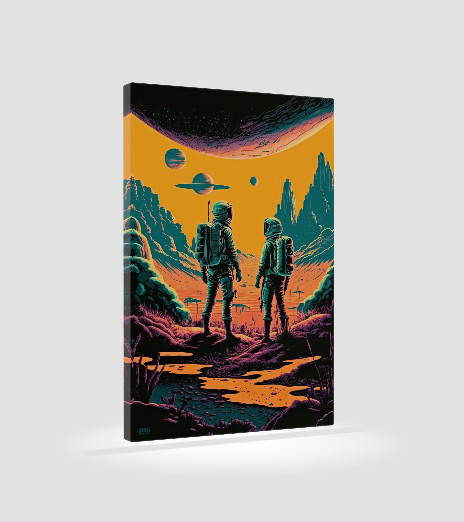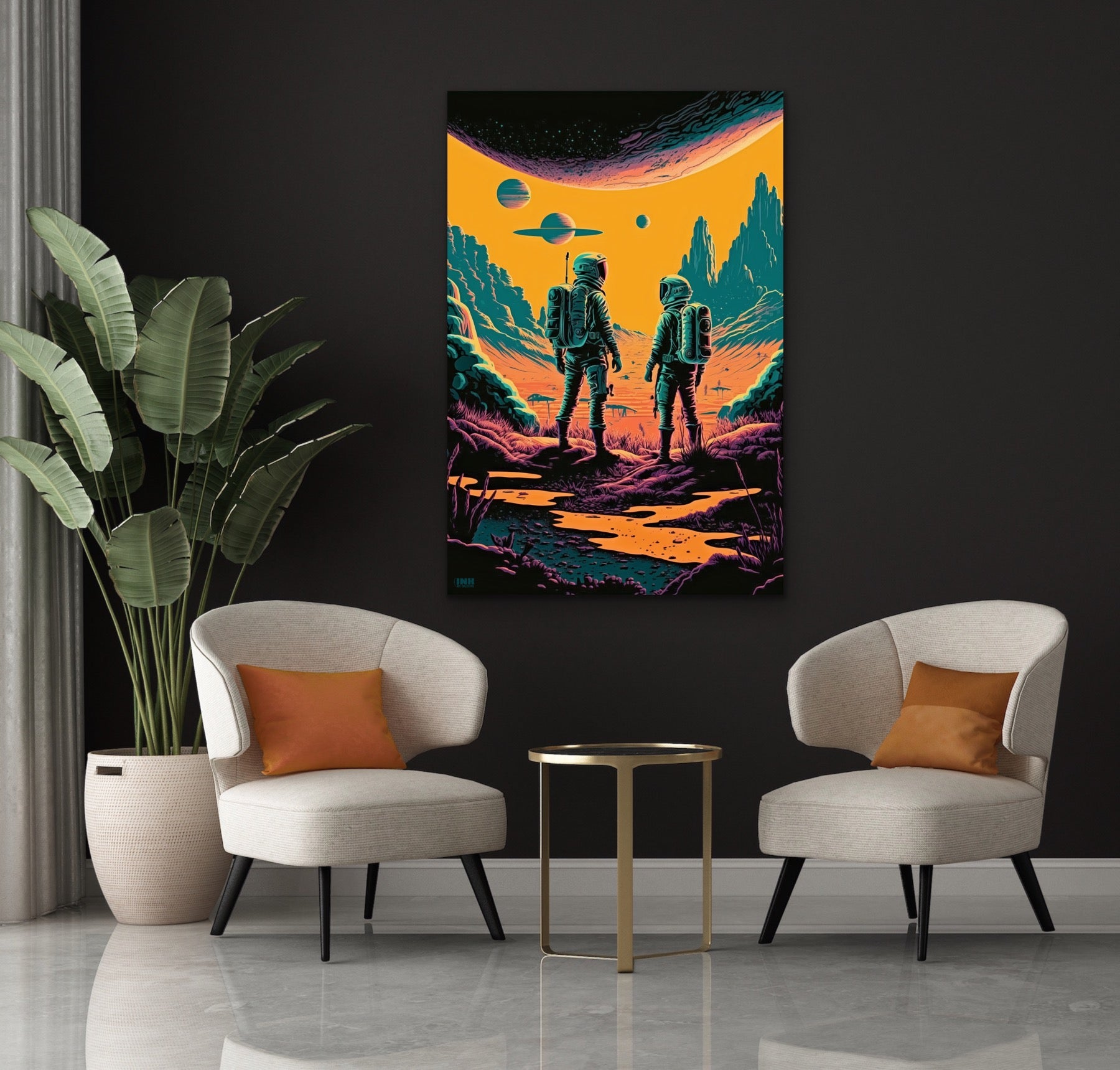 Step into another world with this Retro Futuristic Astronaut Canvas Wall Art, featuring two explorers standing on an alien landscape beneath glowing planets and a vibrant neon sky. With bold shades of orange, teal, and purple, this artwork captures the wonder of space exploration with a retro sci-fi twist.