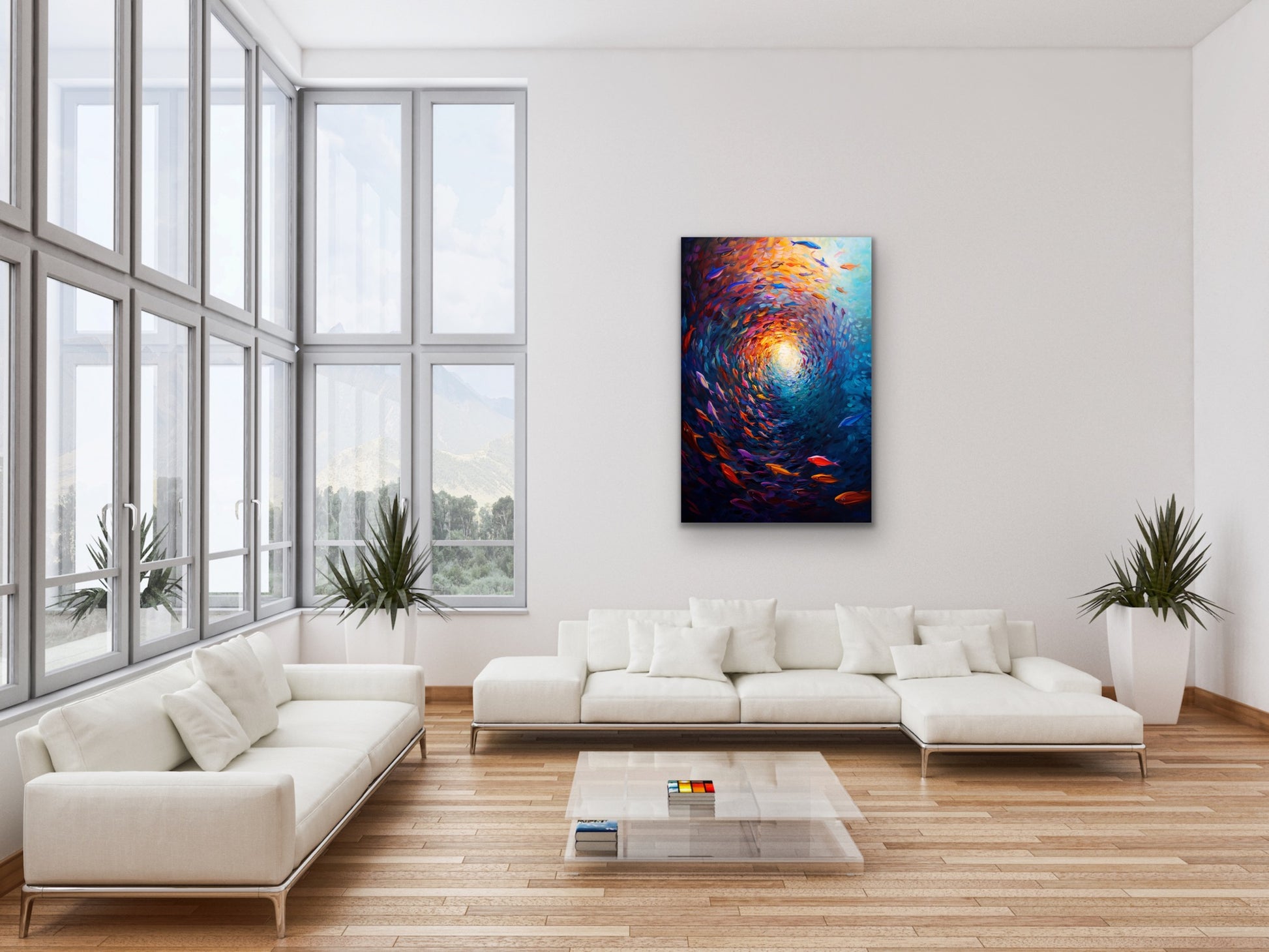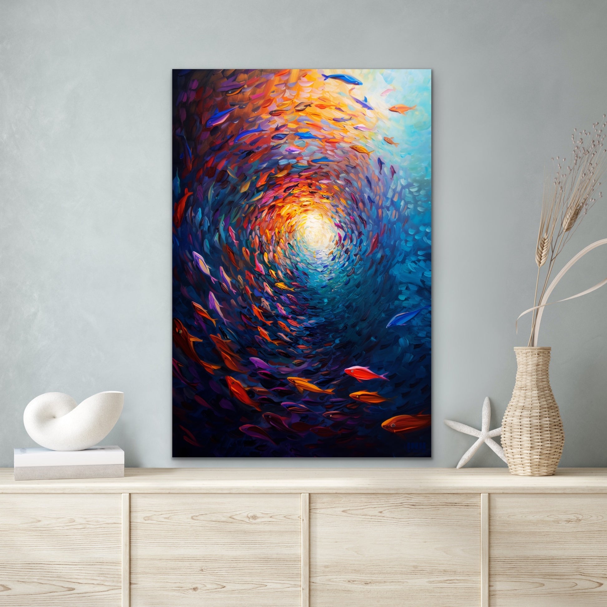 Immerse yourself in the beauty of the ocean with the School of Fish Canvas Wall Art. This vibrant piece captures a swirling formation of fish spiraling toward a glowing light, blending bold blues, fiery oranges, deep reds, and purples into a stunning underwater vortex. The movement and color create a sense of energy, flow, and life that transforms any room.