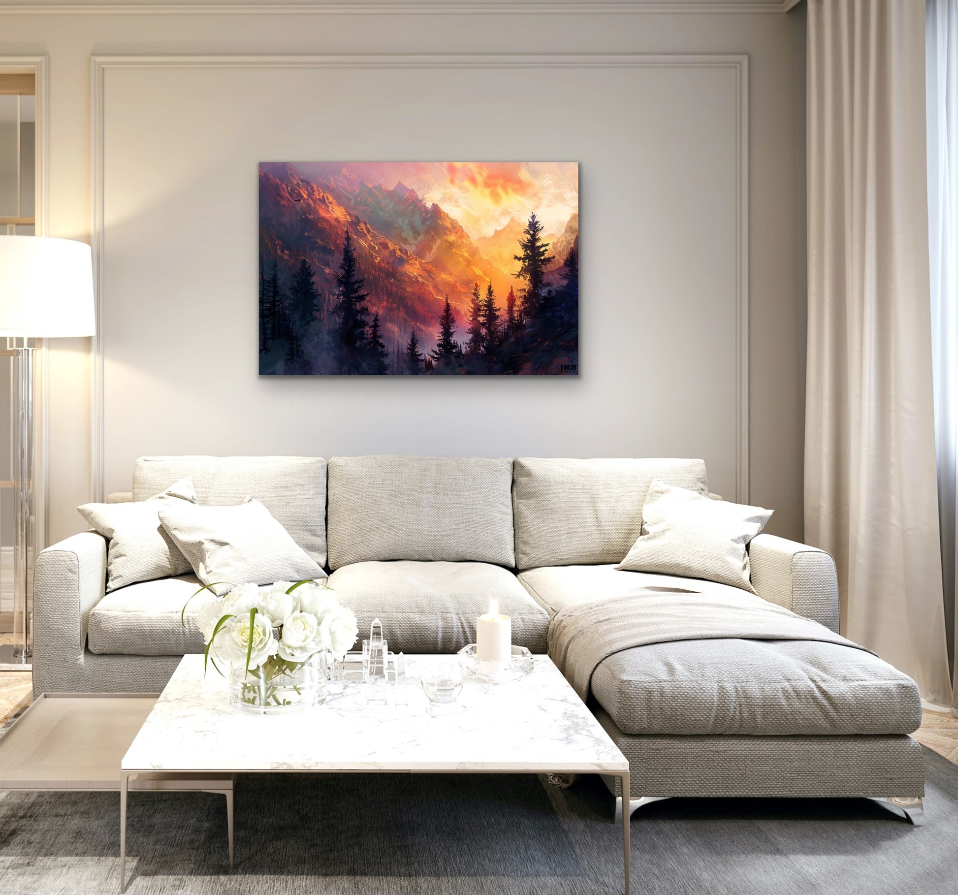 Introducing the "Mountain Sunset" canvas art print, a breathtaking masterpiece that captures the majestic allure of a mountain sunset in rich and vibrant acrylic hues. Meticulously crafted, this artwork invites you to witness the awe-inspiring transformation of rugged peaks as they bask in the warm embrace of the setting sun.