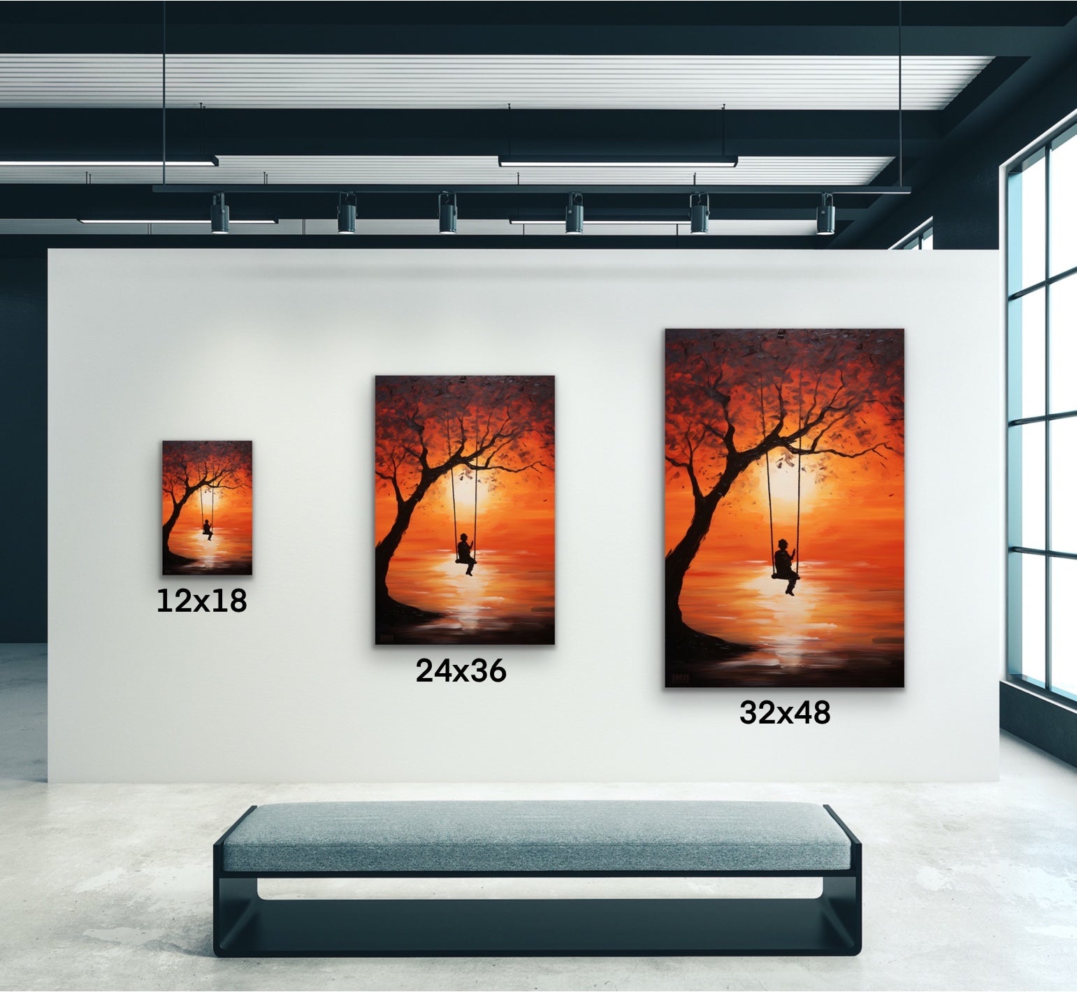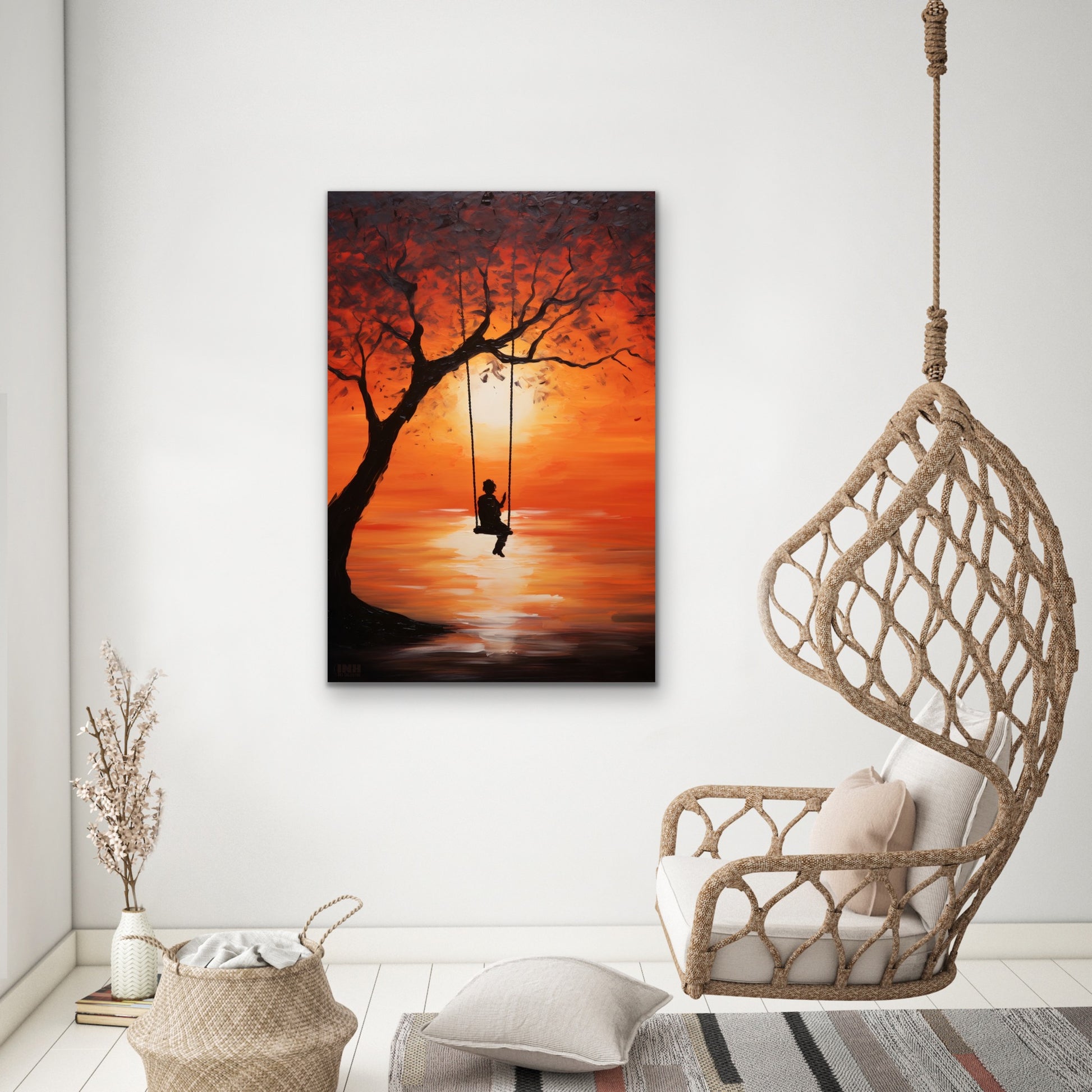 Embrace the beauty of simplicity with the Sunset Swing Canvas Wall Art. This serene painting captures the silhouette of a figure gently swaying from a tree swing as the golden sun sets over calm waters. The fiery orange and red tones of the sunset reflect across the horizon, evoking feelings of peace, nostalgia, and quiet reflection.