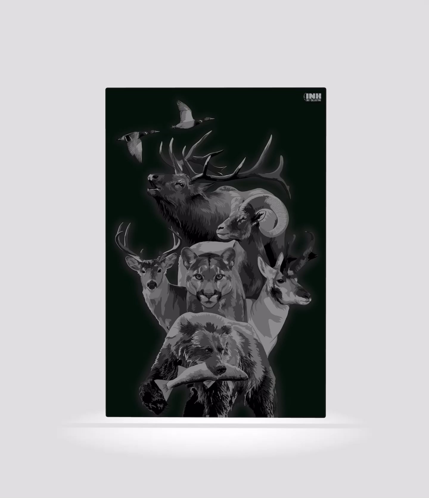 Capture the untamed spirit of the great outdoors with the Wilderness Majesty Canvas Wall Art. This bold black-and-white composition unites iconic North American wildlife into one powerful design. From the fierce cougar and regal elk to the rugged bear clutching a fish, each animal is rendered in striking detail and contrast. Ducks in flight and the curling horns of the bighorn ram add dynamic energy, making this piece a tribute to nature’s strength and resilience.